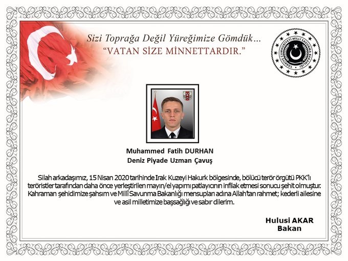 Milli Savunma Bakanlığı Deniz Piyade Uzman Çavuş Muhammed Fatih Durhan'ın "Irak Kuzeyi Hakurk’ta 1 Kahraman Silah Arkadaşımız Şehit Oldu" diyerek duyurdu.