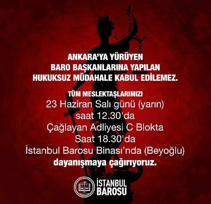 İstanbul Barosu meslektaşlarına çağrı yaptı. Çağrıda; "Ankara'ya yürüyen Baro Başkanlarına yapılan hukuksuz müdahale kabul edilemez. Tüm meslektaşlarımızı 23 Haziran Salı günü Saat: 12.30'da Çağlayan adliyesi C Blokta ve Saat: 1830'da da İstanbul Barosu Binasında (Beyoğlu) dayanışmaya çağırıyoruz...