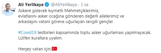 Twitter'dan açıklama yapan Yerlikaya, "Askere gidecek kıymetli Mehmetçiklerimiz, evlatlarını asker ocağına gönderen değerli ailelerimiz ve arkadaşını vatani göreve uğurlayan sevgili gençler #Covid19 tedbirleri kapsamında toplu asker uğurlaması yapılmayacak. Lütfen kurallara uyalım" ifadelerini kullandı.