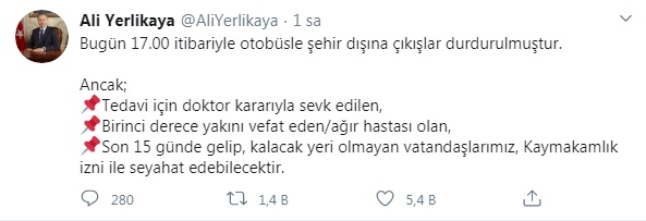 Yerlikaya, "Bugün 17.00 itibariyle otobüsle şehir dışına çıkışlar durdurulmuştur. Tedavi için doktor kararıyla sevk edilen, birinci derece yakını vefat eden/ağır hastası olan, son 15 günde gelip, kalacak yeri olmayan vatandaşlarımız kaymakamlık izni ile seyahat edebilecektir" dedi.
