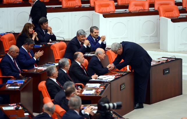 MHP Genel Başkanı Devlet Bahçeli, ant içme töreni sırasında salondan çıktı. Bahçeli’nin salondan çıkması esnasında ayağa kalkan İYİ Parti Milletvekili Arkaz, Bahçeli’nin elini öptü. İYİ Parti Genel Başkan Yardımcısı ve İzmir Milletvekili Müsavat Dervişoğlu da yemin ettikten sonra Bahçeli'nin elini öptü.
