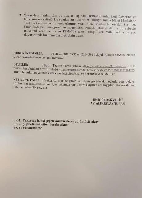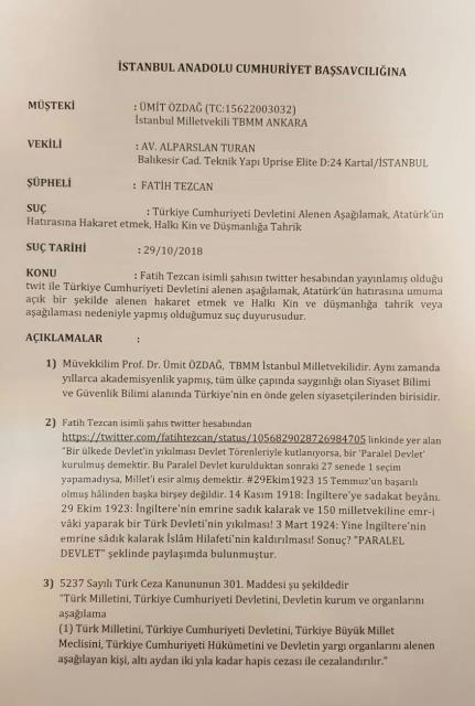 İYİ Parti Genel Başkan Yardımcısı ve İstanbul Milletvekili Ümit Özdağ, Cumhuriyet'in ilan edildiği yılı darbe girişimine benzeterek '15 Temmuz'un başarılı olmuş hali' sözleri nedeniyle hükümete yakınlığıyla bilinen Fatih Tezcan hakkında "Türkiye Cumhuriyeti Devleti'ni alenen aşağılamak, Atatürk'ün hatırasına hakaret etmek, halkı kin ve düşmanlığa tahrik rtmek"ten İstanbul Anadolu Cumhuriyet Başsavcılığı'na suç duyurusunda bulundu.