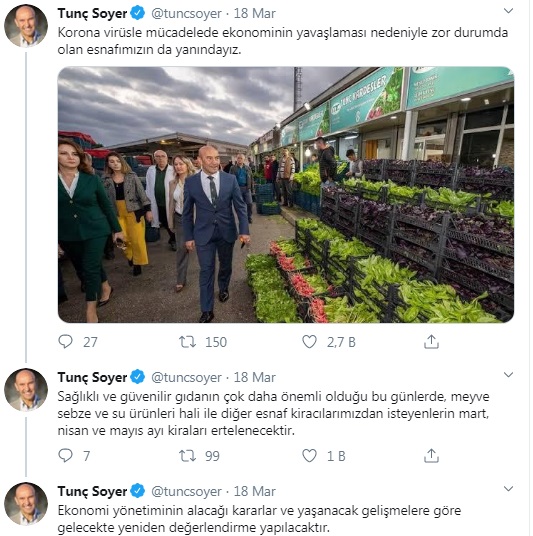 Soyer, koronavirüs ile mücadele kapsamında, esnaflardan kira alınmayacağını duyurdu. Sosyal medyadaki hesabından paylaşım yapan Soyer, şu ifadelere yer verdi: