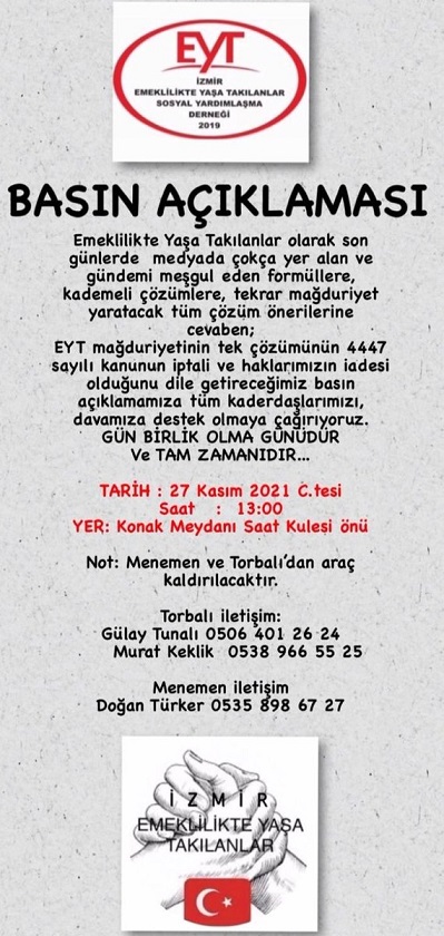 İzmir Emeklilikte Yaşa Takılanlar (EYT) Sosyal Yardımlaşma Derneği, 27 Kasım Cumartesi günü İzmir Konak Meydanı'nda basın açıklaması yapacak.