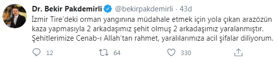Bakan Pakdemirli, Twitter hesabından yaptığı açıklamada, "İzmir Tire’deki orman yangınına müdahale etmek için yola çıkan arazözün kaza yapmasıyla 2 arkadaşımız şehit olmuş 2 arkadaşımız yaralanmıştır. Şehitlerimize Cenab-ı Allah’tan rahmet, yaralılarımıza acil şifalar diliyorum" ifadelerini kullandı.