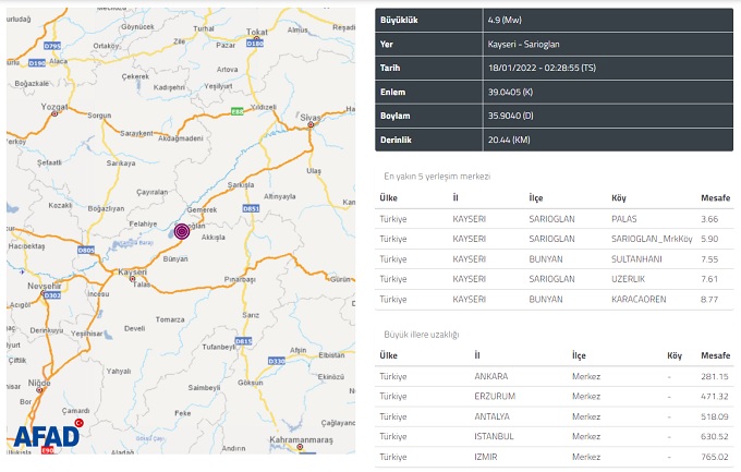 AFAD'dan yapılan açıklamaya göre gece 02.28'de Kayseri, Saıoğlan'da 4.9 şiddetinde deprem oldu. Deprem çevre illerden de hissedildi. AFAD bölgede saha tarama çalışmalarına devam ediliyor.