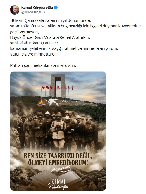 CHP'nin 7. Genel Başkanı Kemal Kılıçdaroğlu'ndan 18 Mart Çanakkale Zaferi’nin 111. yıl dönümünde yayımladığı mesajında;
