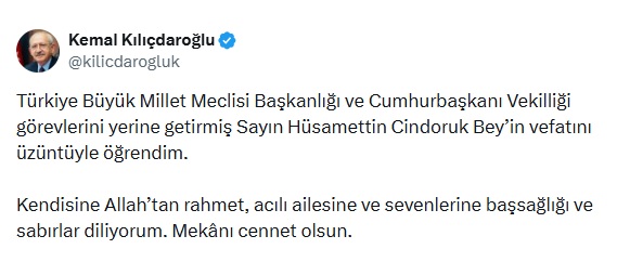 CHP'nin 7. Genel Başkanı Kılıçdaroğlu: "Sayın Hüsamettin Cindoruk Bey’in vefatını üzüntüyle öğrendim. Kendisine Allah’tan rahmet, acılı ailesine ve sevenlerine başsağlığı ve sabırlar diliyorum. Mekânı cennet olsun."
