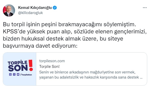 "Bu torpil işinin peşini bırakmayacağımı söylemiştim. KPSS’de yüksek puan alıp, sözlüde elenen gençlerimizi, bizden hukuksal destek almak üzere, torpileson.com'a başvurmaları çağrısında bulundu."