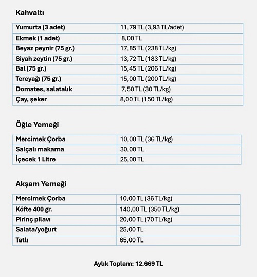 Sadece temel gıda maddeleriyle karınlarını doyurmalarının, günlük maliyeti 422,31 aylık maliyeti 12.669 TL. Sofraya, bırak senin çok sevdiğin kestane balı, manda yoğurdunu koymayı, öğlenki makarnaya kıyma koyamadık!