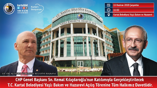 "Kartal halkının takdiriyle 2009 yılında çıktığımız bu yolda; “İNSAN”ı önceleyen çalışmalarımız ve Türkiye’de ilk kez hayat verdiğimiz projelerimizle öncü olmaya devam ediyoruz. Sosyal Belediyecilik anlayışıyla 9 yıl boyunca; gençlerimize, kadınlarımıza, engelli vatandaşlarımıza ve çocuklarımıza tanıdığımız öncelik ve bu doğrultuda gerçekleştirdiğimiz çalışmalarımızı, yaşlılarımız için açılışını düzenleyeceğimiz Yaşlı Bakım ve Huzurevi projemizle taçlandırıyoruz. Sosyal Belediyeciliğin en iyi örneklerinden biri olan Kartal Belediyesi Yaşlı Bakım ve Huzurevi binasının açılışını; Cumhuriyet Halk Partisi Genel Başkanı Sayın Kemal Kılıçdaroğlu ve Kartal Belediye Başkanı Op. Dr. Altınok Öz’ün katılımlarıyla gerçekleştiriyoruz.
