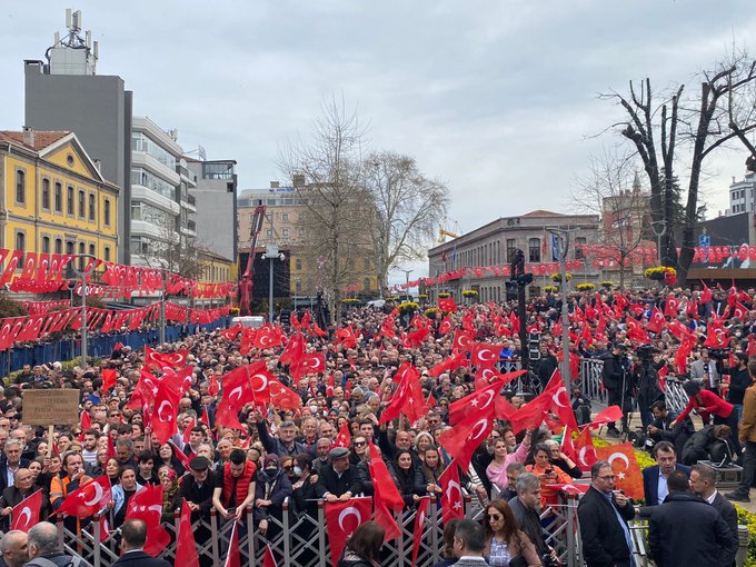 Millet İttifakı’nın 13. Cumhurbaşkanı adayı Kemal Kılıçdaroğlu ile İBB Başkanı ve Cumhurbaşkanı yardımcısı adayı Ekrem İmamoğlu, Trabzon Atatürk Meydanı’nda düzenlenen “Millet Buluşmaları”na katıldı. Meydanı hınca hınç dolduran coşkulu kalabalık, Kılıçdaroğlu ve İmamoğlu’na sevgi gösterilerinde bulundu. Kılıçdaroğlu ve İmamoğlu, kendilerine sevgi gösterilerinde bulunan vatandaşlara, elleriyle kalp işareti yaparak karşılık verdi. Kılıçdaroğlu ve İmamoğlu’nun konuşmaları öncesinde, mikrofondan deprem felaketinden etkilenen iller sayıldı. Vatandaşlar, her il anonsunda “Burada” diyerek karşılık verdi. Kılıçdaroğlu’nu konuşma yapacağı mikrofona İmamoğlu anons etti. İmamoğlu, “ev sahibi” sıfatıyla Kılıçdaroğlu’na 13 numaralı Trabzonspor forması, atkısı ve kasket sundu.