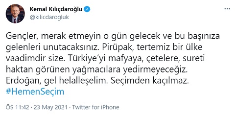 CHP Genel Başkanı Kemal Kılıçdaroğlu, gençlere yaptığı çağrı ile AKP Genel Başkanı ve Cumhurbaşkanı Recep Tatyyip Erdoğan'a #ErkenSeçim çağrısında; "Gençler, merak etmeyin o gün gelecek ve bu başınıza gelenleri unutacaksınız. Pirüpak, tertemiz bir ülke vaadimdir size. Türkiye’yi mafyaya, çetelere, sureti haktan görünen yağmacılara yedirmeyeceğiz. Erdoğan, gel helalleşelim. Seçimden kaçılmaz. #HemenSeçim" dedi.