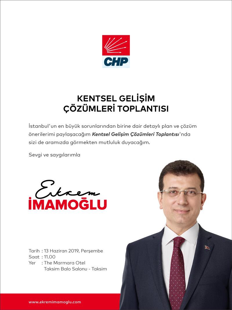 İstanbul Büyükşehir Belediyesi'nin Seçilmiş başkanı Ekrem İmamoğlu projelerinden "Kentsel Gelişim Çözümleri"ni 13 Haziran Perşembe günü saat: 11.00'da The Marmara Otelin Taksim Balo slonunda bir basın toplantısı ile duyuracak...