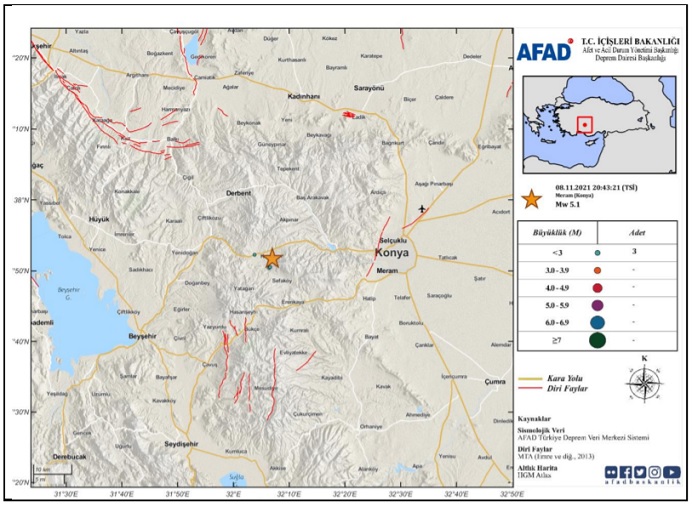 "08.11.2021 günü, Türkiye saati ile 20:43'te merkez üssü Meram (Konya) olan Mw 5.1 büyüklüğünde bir deprem meydana gelmiştir.Yerin 6.82 km derininde meydana gelen bu depremin en yakın yerleşim birimi olan Konya ilinin Meram ilçesine bağlı Kizilören_mrkköy köyüne uzaklığı 0.29 km'dir (Tablo 1.1). Ana şoktan, 08.11.2021 21:11'e kadar geçen zamanda, büyüklükleri 1.7 ile 2.8 arasında değişen 3 artçı deprem kaydedilmiştir (Şekil 1.1). Depremin belirgin süresi ise 9.54 sn olarak hesaplanmıştır." denildi.