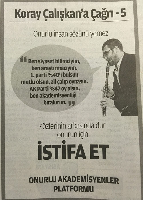 1 Kasım seçimlerinden önce AKP'nin yüzde 47 oy alması halinde istifa edeceğini canlı yayında açıklayan Koray Çalışkan'a gazete ilanı ile çağrı yapıldı.