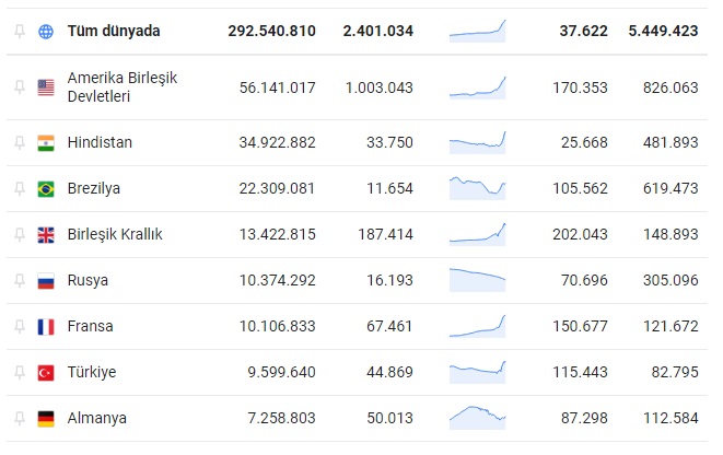 Koronavirüs salgınında dünyada ölenlerin sayısı 5.449.423, vaka sayısı ise 292.540.810 oldu