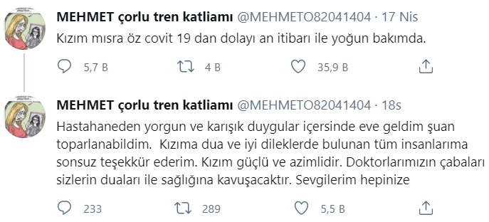 Çorlu'daki tren faciasında oğlu Oğuz Arda Sel'i ve eşi Hakan Sel'li kaybeden Mısra Öz Sel’in koronavirüs nedeniyle yoğun bakıma alındı. Mısra Öz’ün babası Mehmet Öz sosyal medya hesabından yaptığı paylaşımda;