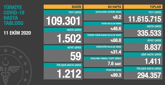 Sağlık Bakanlığı tarafından 11 Ekim 2020 tarihli, Türkiye Günlük Koronavirüs Covid_19 Tablosu paylaşıldı.