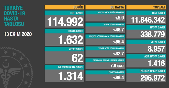 Sağlık Bakanlığı tarafından 13 Ekim 2020 tarihli, Türkiye Günlük Koronavirüs Covid_19 Tablosu paylaşıldı.