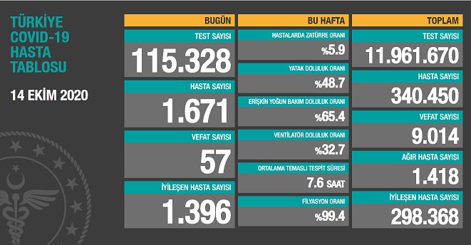 Sağlık Bakanlığı tarafından 14 Ekim 2020 tarihli, Türkiye Günlük Koronavirüs Covid_19 Tablosu paylaşıldı.