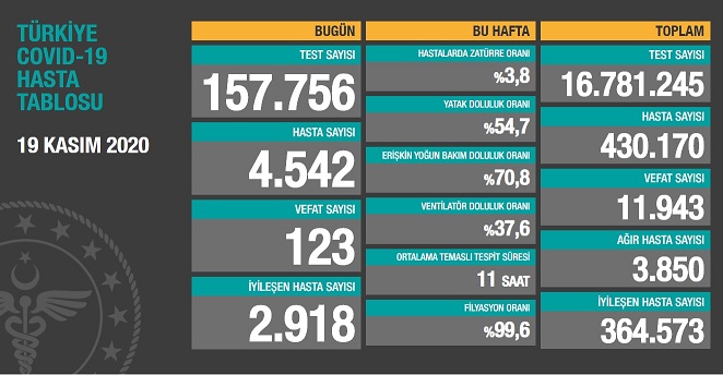 Sağlık Bakanlığı tarafından 19 Kasım 2020 tarihli, Türkiye Günlük Koronavirüs Covid_19 Tablosu paylaşıldı.