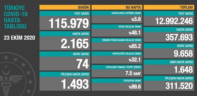 Sağlık Bakanı Dr. Fahrettin Koca, 23 Ekim Sağlık Bakanlığının Türkiye güncel verilerini paylaştı; Pandemi Koronavirüs Covid_19'dan bugün 74, toplamda 9.658 kişi hayatını kaybetti.
