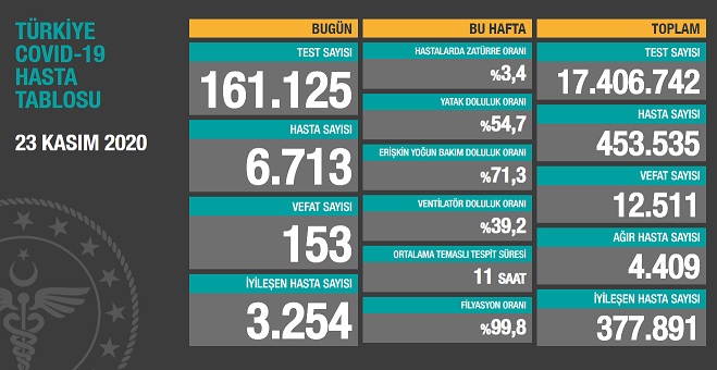 Sağlık Bakanlığı tarafından 23 Kasım 2020 tarihli, Türkiye Günlük Koronavirüs Covid_19 Tablosu paylaşıldı.