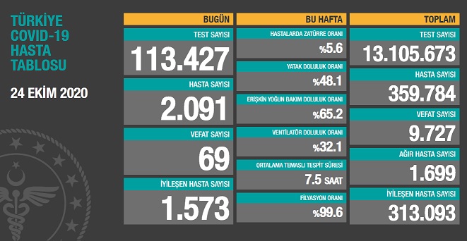 Sağlık Bakanı Dr. Fahrettin Koca sosyal medya hesabından yaptığı açıklamzda: "Bugün yapılan 113.427 test sonucunda 2.091 yeni hasta tespit edildi. Ağır hasta sayımız artmaya devam ediyor. Hastaların tedavisi özveri ile çalışan sağlık çalışanlarımıza emanet. Tedbirlere uymak ise bizim sorumluluğumuz. Birlikte mücadele edelim" dedi.