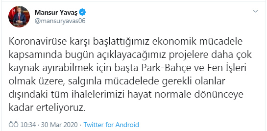 Mansur Yavaş'ın sosyal medyadan ihalelerin ertelendğini şu ifadeler duyuru: