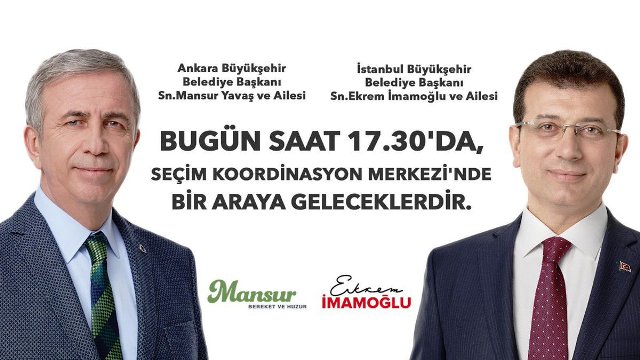 Resmi olmayan sonuçlara göre Ankara Büyükşehir Belediye Başkanı seçilen Mansur Yavaş ve İstanbul Büyükşehir Belediye Başkanı seçilen Ekrem İmamoğlu, bugün (2 Nisan Salı) Ankara'da buluşacak.