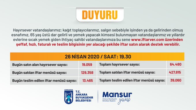 iftarver.com adresi üzerinden Ankara Büyükşehir Bediyesi iştiraki olan BELPA AŞ. aracılığıyla başlatılan ve bir iftar paketinin 15 TL olduğu kampanyaya katılım artarak sürüyor.
