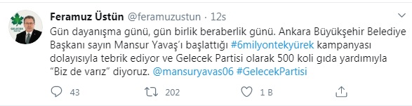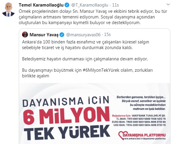 Mansur Yavaş Twttier hesabından yaptığı duyuruda “Ankara'da 100 binden fazla esnafımız ve çalışanları küresel salgın sebebiyle ticaret ve iş hayatını durdurmak zorunda kaldı. Belediyemiz hayatın durmaması için çalışmalarına devam ediyor. Bu dayanışmayı büyütmek için #6MilyonTekYürek olalım, zorlukları birlikte aşalım” çağrısı yaptı.