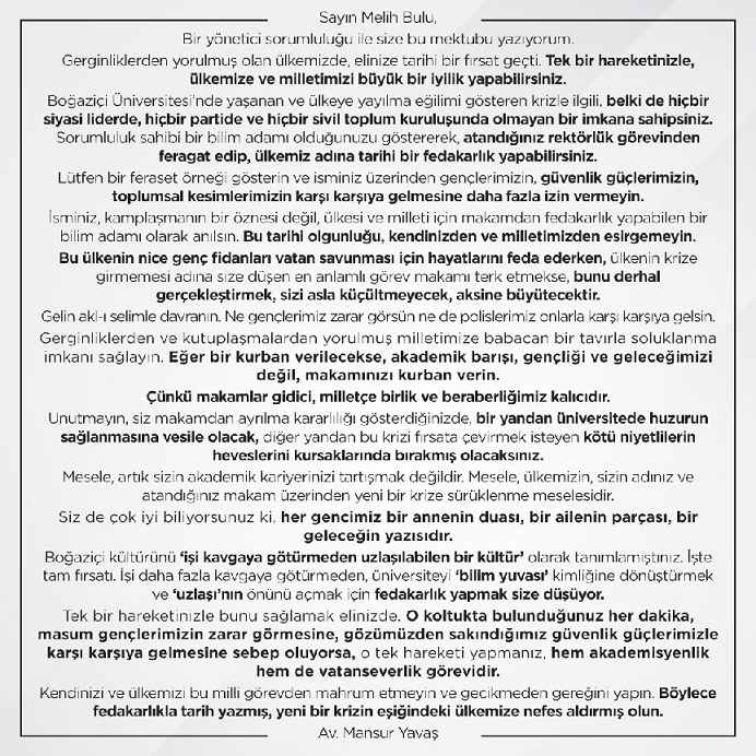 ABB Başkanı Mansur Yavaş sosyal medya hesabından Boğaziçi Üniversitesinde yaşananlar ve öğrencilere yapılan haksız müdahaleler sonrası Rektör olarak atanan Dr. Melih Bulu'yu mektup ile istifaya devat etti.