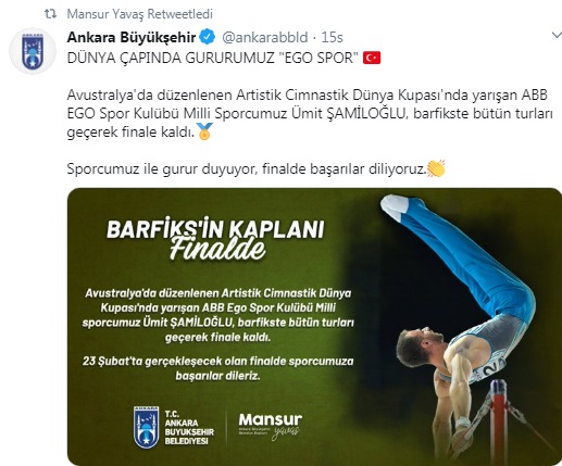 Ankara Büyükşehir Belediye Başkanı Mansur Yavaş sosyal mdya hesabından Avustralya'da düzenlenen Artistik Cimnastik Dünya Kupası'nda finale kalan ABB EGO Spor Kulübü milli sporcu Ümit Şamiloğlu'na başarı dileklerinde bulundu. Yavaş mesajında "Avustralya'da düzenlenen Artistik Cimnastik Dünya Kupası'nda yarışan ABB EGO Spor Kulübü Milli Sporcumuz Ümit ŞAMİLOĞLU, barfikste bütün turları geçerek finale kaldı. Sporcumuz ile gurur duyuyor, finalde başarılar diliyoruz" ifadelerini paykaştı