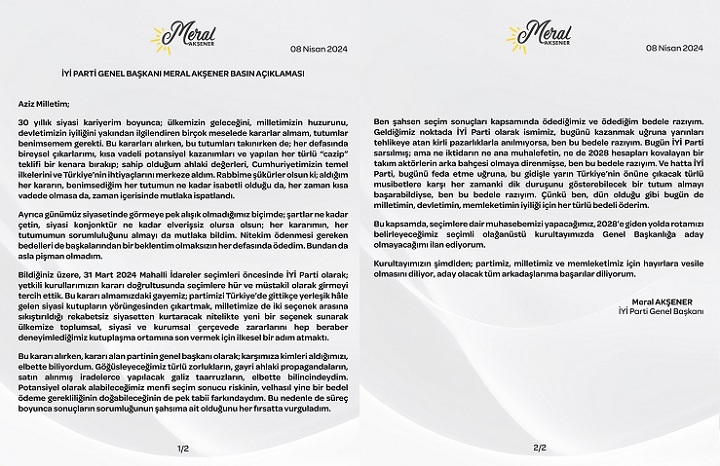 İYİ Parti Genel Başknı Meral Akşener, X hesabından paylaştığı yazılı açıklamada, "2028’e giden yolda rotamızı belirleyeceğimiz seçimli olağanüstü kurultayımızda Genel Başkanlığa aday olmayacağımı ilan ediyorum" ifadelerini kullandı.