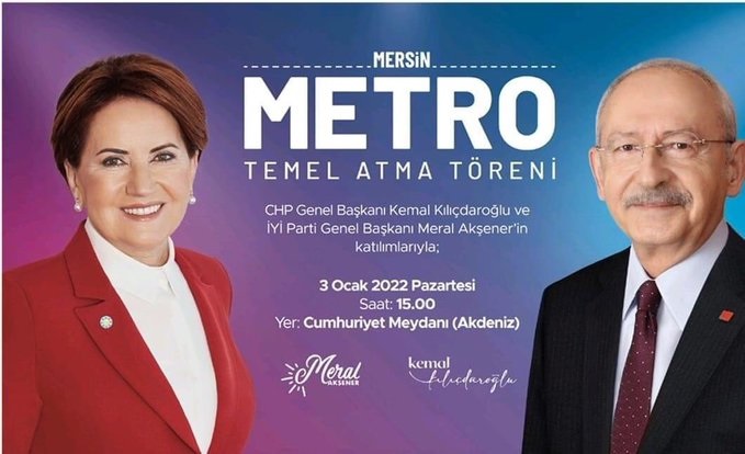 Mersin Büyükşehir Belediye Başkanı Vahap Seçer'i daveti ile Mersin Metrosu Temel Atma Töreni, Cumhuriyet Halk Partisi Genel Başkanı Kemal Kılıçdaroğlu ve İYİ Parti Genel Başkanı Meral Akşener'in katılımıyla 3 Ocak Pazartesi günü, Saat:15.00'te, Cumhuriyet Meydanı'nda gerçekleştirilecek.