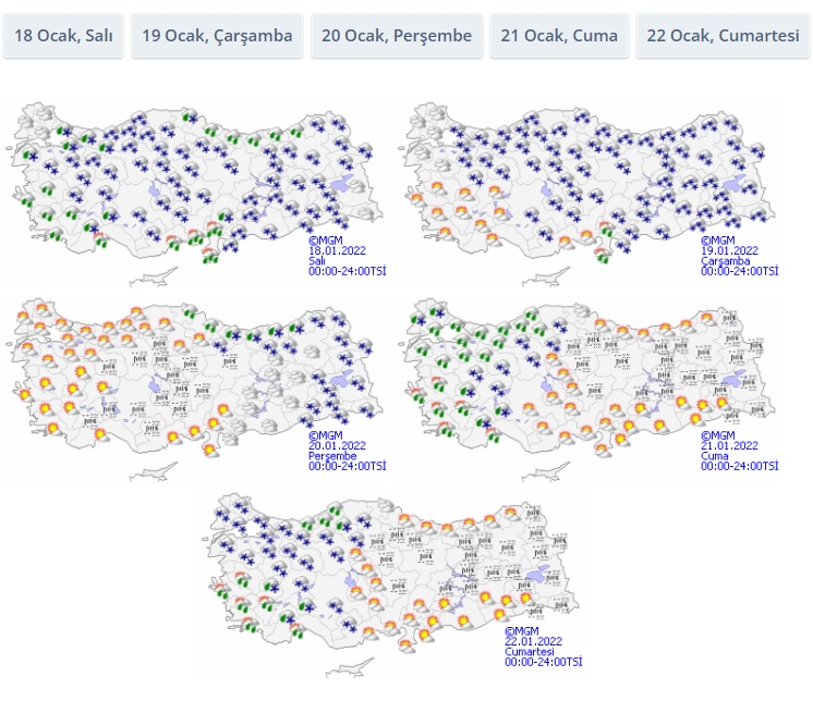 Meteoroloji Genel Müdürlüğünden yapılan açıklamaya göre 18 Ocak 2022 (Salı) Marmara, İç Ege, Batı Karadeniz ve Güneydoğu Anadolu'da 2 ila 4 derece azalacağı, Kuvvetli Yağışlara, Kuvvetli Rüzgara, Zirai Don Riskine ve Çığ Riskine karşı dikkat edilmesi konusunda uyarılar yapıldı.
