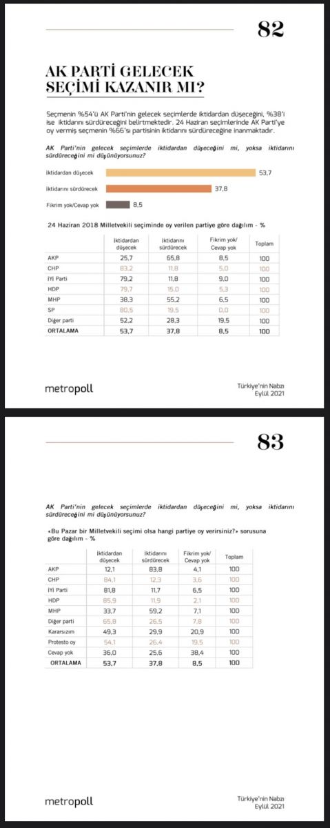 Ankete katılan seçmenlerin yüzde 53,7'si AKP'nin gelecek seçimlerde iktidardan düşeceğini, yüzde 37,8'i ise iktidarını sürdüreceğini belirtti. Yüzde 8,5’i ise “Fikrim/Cevabım yok” yanıtını verdi.