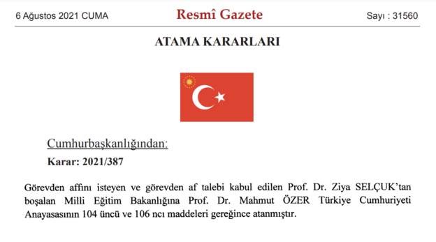 Resmi Gazete'de yayımlanan karara göre Cumhurbaşkanı Recep Tayyip Erdoğan, görevinden istifa eden Milli Eğitim Bakanı Ziya Selçuk'un yerine bakan yardımcısı olarak görev yapan Mahmut Özer'i Milli Eğitim Bakanı olarak atadı.
