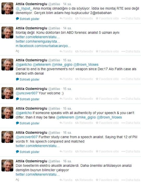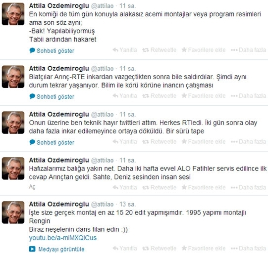Başbakan Recep Tayyip Erdoğan ve oğlu Bilal Erdoğan'a ait olduğu iddia edilen ses kayıtlarına ilişkin olarak, kayıtların yayınlandığı akşam ve dün, 'montaj değil' diyen, müzisyen ve ses uzmanı Atilla Özdemiroğlu, Twitter hesabından yeni paylaşımlarda bulundu.