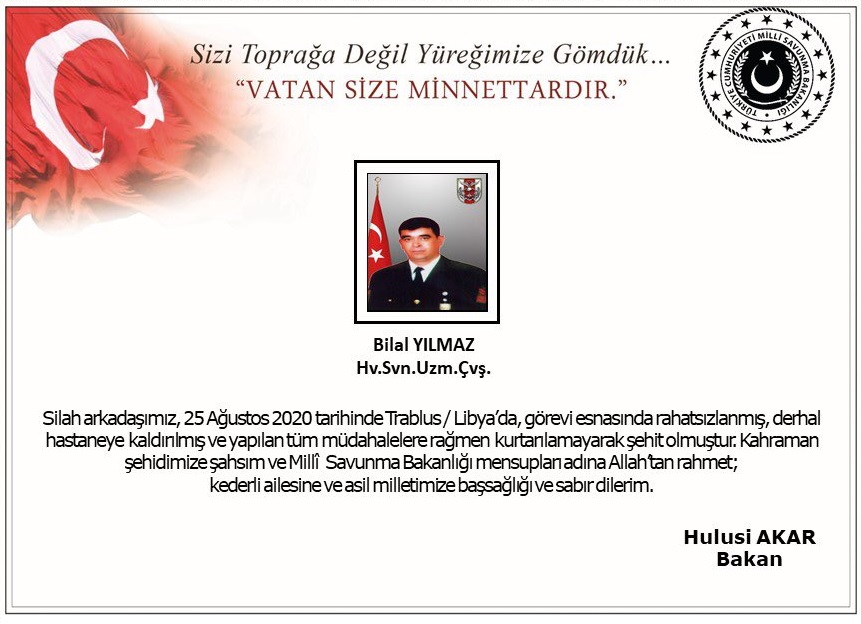 Milli Savunma Bakanı Hulusi Akar imzalı yapılan yazılı açıklamada; Libya, Trablus'da görevi sırasında rahatsızlanan Hava Savunma Uzman Çavuşu Bilal Yıldırım, kaldırıldığı hastanede tüm müdahalelere rağmen kurtarılamayarak şehit olmuştur. Kahraman şehidimize şahsım ve Milli Savunma Bakanlığı mensupları adına Allah'tan rahmet; kederli ailesine ve asil milletimize başsağlığı ve sabır dilerim" denildi.