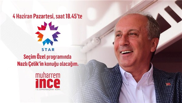 CHP'nin Cumhurbaşkanı adayı Muharrem İnce, bugün (4 Haziran Pazartesi) Star TV'de yayınlanan “Seçim Özel” programına konuk oluyor.