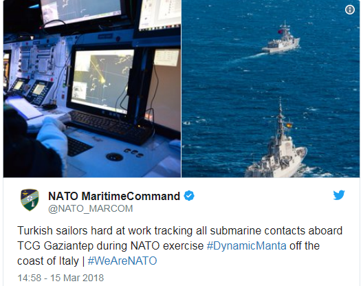 İtalya'nın kuzey kıyılarında 6 Mart'ta Dynamic Manta 2018 tatbikatı başlamıştı. NATO bünyesindeki tatbikata ABD, Almanya, Fransa, İspanya ve Yunanistan'ın da aralarında bulunduğu 10 ülkenin deniz kuvvetleri var. Türkiye de bu tatbikattaki en etkili deniz güçlerinden biri. Türkiye tatbikata TCG Gaziantep gemisi ve Preveze denizaltısının da içinde olduğu bir deniz gücüyle katıldı.
