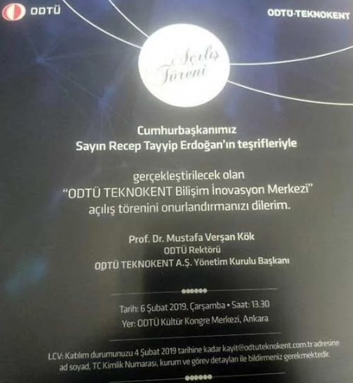 Teknokent’e bulunan firmalara dağıtılan, ODTÜ Rektörü Prof. Dr. Mustafa Verşan Kök imzalı afişlerde "Cumhurbaşkanımız Sayın Recep Tayyip Erdoğan’ın teşrifleriyle gerçekleştirilecek olan ‘ODTÜ TEKNOKENT Bilişim İnovasyon Merkezi’ açılış törenini onurlandırmanızı dilerim” denildi. Ayrıca törenin 6 Şubat Çarşamba günü saat 13.30’da Aykut Kence Evrim Konferansı başta olmak üzere çeşitli öğrenci etkinliklerine tadilatta olduğu gerekçesiyle verilmeyen Kültür Kongre Merkezi’nde olması dikkat çekerken, afişlerde katılmak isteyen kişilerin etkinlikten iki gün önceye kadar ad soyad, TC kimlik no ve kurum bilgilerini ilgili e-posta adresine göndermeleri gerektiği yazıldı.