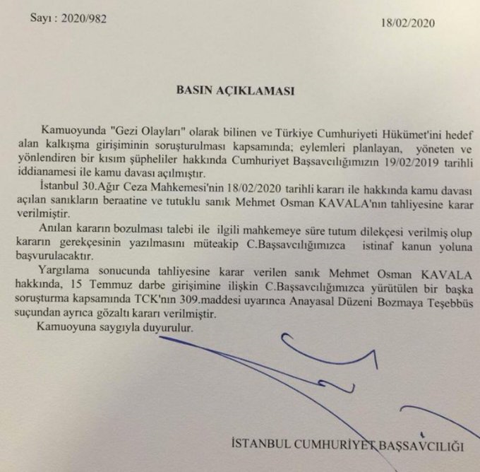 İstanbul 30. Ağır Ceza Mahkemesi'nin 18 Şubat 2020 tarihi kararı ile hakkında kamu davası açılan sanıkların beraatına ve tutuklu sanık Mehmet Osman Kavala'nın tahliyesine karar verilmiştir. Alınan kararın bozulması talebi ile ilgili mahkemeye süre tutum dilekçesi verilmiş olup kararın gerekçesinin yazılmasını müteakip Cumhuriyet Başsavcılığı'mızca istinaf kanun yoluna başvurulacaktır.