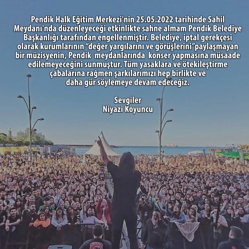 "Pendik Halk Eğitim Merkezi'nin 25.05.2022 tarihinde Sahil Meydanı'nda düzenleyeceği etkinlikte sahne almam Pendik Belediye Başkanlığı tarafından engellenmiştir.