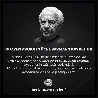 "DUAYEN AV. YÜCEL SAYMAN’I KAYBETTİK İstanbul Barosu eski başkanlarından, duayen avukat, yetkin akademisyen ve yazar Av. Prof. Dr. Yücel Sayman’ı kaybetmenin üzüntüsü içerisindeyiz. Meslek ustamıza rahmet; ailesine, öğrencilerine, hukuk ve akademi camiasına başsağlığı dileriz." dedi.