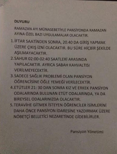 Cumhuriyet'ten Ahmet Şefik'in haberine göre; okulun pansiyonunda dağıtılan ve panoya asılan ilanda “Ramazan ayı münasebetiyle pansiyonda Ramazan ayına özel bazı uygulamalar olacaktır. İftar saatinden sonra 20.40’da giriş yapmak üzere çıkış izni olacaktır. Bu süre hiçbir şekilde aşılmayacaktır. Sahur saat 02.00-02.40 saatleri arasında yapılacaktır. Ayrıca sabah kahvaltısı verilmeyecektir. Sadece sağlık problemi olan pansiyon öğrencilerine öğle yemeği verilecektir. Etütler saat 21.30’dan sonra kız ve erkek pansiyon odalarında bulunan etüt odalarında ya da bireysel odalarınızda olacaktır. Teravihe gitmek isteyen öğrenciler isimlerini önce pansiyon idaresine yazdırmak üzere nöbetçi belletici nezaretinde gidebilir” denildi.