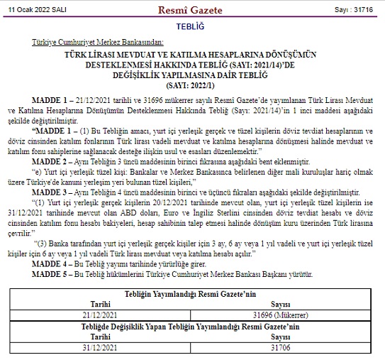 Türk Lirası Mevduat ve Katılma Hesaplarına Dönüşümün Desteklenmesi Hakkında Tebliğ’de Değişiklik Yapılmasına Dair Tebliğ, Resmi Gazete’nin 11 Ocak 2022 tarihli nüshasında yayımlandı. Tebliğin amacı, "yurt içi yerleşik gerçek ve tüzel kişilerin döviz tevdiat hesaplarının ve döviz cinsinden katılım fonlarının Türk lirası vadeli mevduat ve katılma hesaplarına dönüşmesi halinde mevduat ve katılım fonu sahiplerine sağlanacak desteğe ilişkin usul ve esasları düzenlemek" olarak ifade edildi.